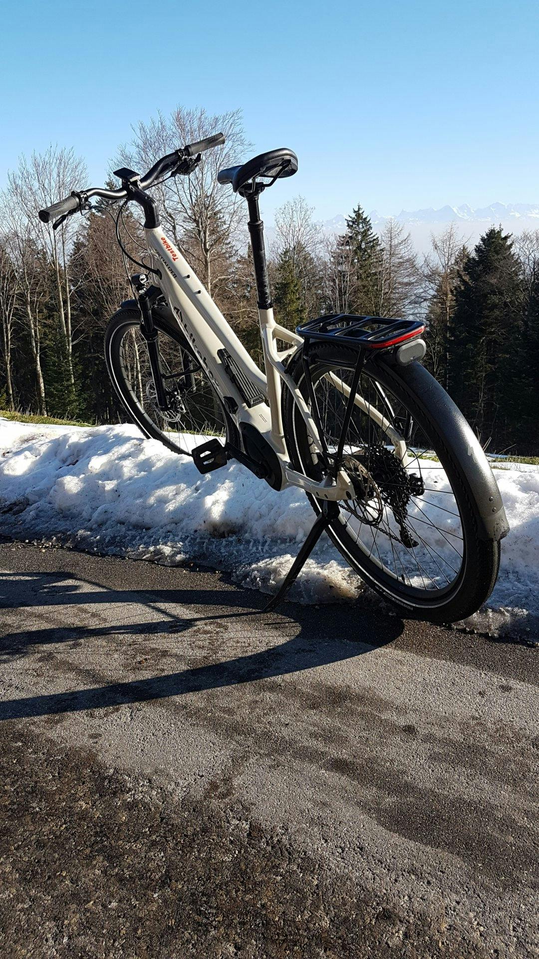 Nach kurzer Rast steige ich wieder auf den Sattel. Ich lasse es den Berg hinunter krachen. Mit dem Vado ist gut rasen. Die fetten Reifen geben eine gute Strassenlage, selbst über kurze Eisplatten sausen sie, ohne zu rutschen. Vor den Kurven ziehen die Bremsen tadellos. Im Nu bin ich unten und nun beginnt das grosse Zittern: Reicht es bis nach Hause? Ich schalte auf Eco, um zu sparen. Und trotzdem läuft der Countdown unbarmherzig weiter. Dass es recht kalt ist, hilft auch nicht. Kurz vor Schüpfen leuchtet die Ladestandanzeige orange: Die 15-Prozent-Grenze ist erreicht.